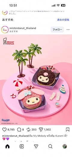 こんばんは!! ほなみです🐻❄️✨ さっきインスタ見てたらこんなの流れてきた☝️ なにこれ可愛すぎんか!? マイメロ大好きでミスドでバイトしてる私からしたらこんなの最高すぎるでしょ"(∩>ω<∩)" こんな可愛いコラボ羨ましいな(๑♡∀♡๑) 切実に日本でもお願いします‼️ ほなみ