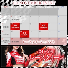 おはようございます🌞 ひまりです🌻 11月のカレンダーでたよー! 今月はレースクイーンイベントです✨ そしてー、バースデーガールが3人もいます!! 10日あむちゃん 13日みなちゃん 18日なるちゃんの誕生日です🥂 3人ともバースデーオリシャンがあるので、3人とものたくさんのお祝いお待ちしてます💕