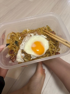 らなです この前は塩焼きそば作りました🥹 ひと玉で作ってたらだんだん味が濃くなってしまって 2玉になりました^^ 冷蔵庫に入れとけばいいから楽だね☺️ ほんでこの写真いつも床で食べてるのばれてまう