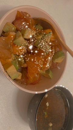 こんばんは🌙𖤐⡱ うたです👸🏻🩷 先週末無性に刺身食べたくなって割引きのお刺身でポキ丼つくった👍🏻 サーモンまぐろブリが入って500円以内でお得すぎた🉐 無事刺身欲も満たされて🐟大満足でした(^-^)