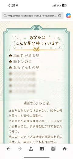 こんにちはあむです🐰. . この前星ひとみの星占いやりました. . 結果としてはこんな感じでした. . 筋トレの星、、、、か、、、、. . ひとみが言うならがんばってみよかなと思いました テレビとかで有名な占い師とかだとちこっと信じちゃうピュアピュアなあむさんでした. .