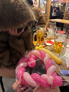 こんばんは みなです😻✨ 今日はサークル卒業生たちと忘年会です! 楽しいんだけどもう酔っ払ったし全然帰りたい^_^; カラオケちょこっとして終電でかーえろっと