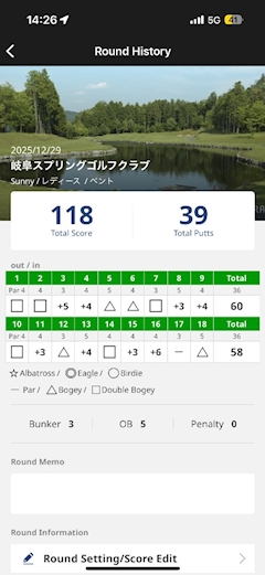 こんばんは みなです😻✨ 今日前半60も叩いて 後半も58で118だった😭 普通にゴルフ始めた手の頃と変わらんくて悲しい またOB5個にバンカーも結構入って 距離も合わずショートショートとかしてたらこうなりました🥲 まぁけどとりあえずOBで-10、 このコース結構むずくてみんないつもより10打くらい多いといってたので-10 って思えば98でいつも通りですね!!!!! それにしても118は叩きすぎでかなり萎えた笑 一緒に回った人たちもみんなこれくらいだったのがまだ救い笑 なんだかいい締めくくりではなかったですが もっと自分のスイング見直して 来年も引き続き頑張りたいと思います🥹