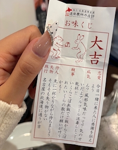 やほん ゆうみです! この前連れてってもらった ご飯屋さんのお箸が おみくじになってた⭐️ 大吉だたよん😌 こーゆーちょっとしたおもしろいやつ 結構すきー! 嘘でも大吉ってでると 嬉しい気持ちになるよね🤭 書いてある内容もおもしろかった🤣 でわ