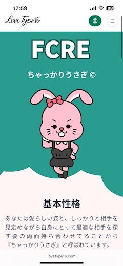 こんばんは🌙 りりです☺️ トラネス営業してます❣️ 流行りに乗ってラブタイプ診断やってみました 診断結果は『ちゃっかりうさぎ』 まとめサイトみたら計算高い性格とか言われてた🥺 こういう系のって 共感するところもうーんてところもあるから あんまり当てにしないタイプ 占いとかおみくじは良いことしか信じないようにしてます✌🏻 その方が生きやすくていいよね😉 診断系は質問答えてる過程がわりと好きなんだけど MBTI診断だけは長すぎたね 2回目はやりたくないです❌ ちなみにISFP(冒険家)だよん それでは本日もご来店お待ちしております🙋🏻♀️ りり🎀