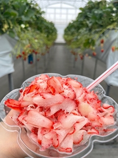 こんばんは😎 ひまりです🌻 いちご狩りで無料で削りいちごが食べれるってなってたから受付で開始する時にすぐ頼んだよねww いちご食べてから削りいちご食べたら酸っぱく感じたけど、 ななちゃんが練乳わけてくれて美味しく食べた🍓🍧