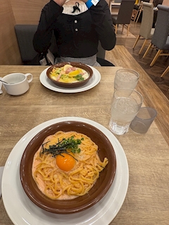 らなです ガスト行くといつも何頼みますか😑 わたしは絶対明太カルボナーラ頼んじゃう🥹 違うのも食べたいのに いつも結局これ^^ 麺がもちもちでうまいんです🥺 次はハンバーグ頼むぞお
