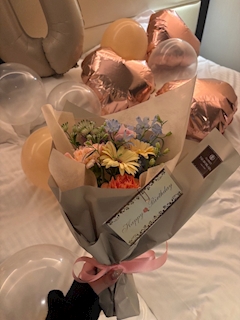 こんにちわー ななです! 花束もとっても可愛いの作ってもらった💛🩷 渡す側やったけど花束取りに行ったらめちゃテンションあがったし嬉しくなった😂 大成功💕💕