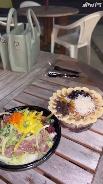 やほん ゆうみです! この前ひまりんと 夕日見に行ったかえりに ホノルルアサイーで アサイーとポキ丼たべた🤍 マグロゴロゴロしてて ほんっとに美味しかった(,,•﹏•,,) テラス席で食べたんやけど 気温もちょうど良くて 幸せすぎた😌🫶🏻 でわ