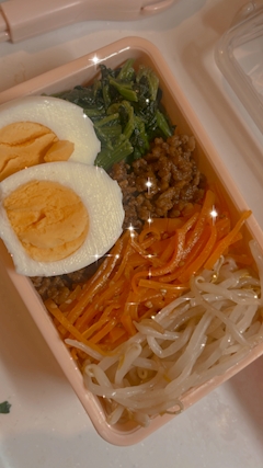 こんにちは うたです👸🏻🩷 今日のおひるごはん作り置きの副菜たちでビビンバ 冷蔵庫につくりおきのゆで卵もあったから入れた👍🏻🥚 今週末お弁当用にハンバーグとか作り置きしよ^-^ 朝はできるだけ楽したいから前日夜とかに準備してたりするまじえら俺😸 やっと金曜日なので午後もがんばります💖