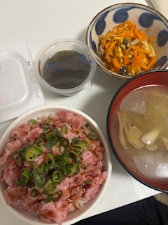 こんばんは みなです😻✨ 今日の夜ご飯 ・ネギトロ丼・舞茸と大根のお味噌汁・人参しりしり・もずく酢・納豆 さすがに健康的すぎるな こうゆうととのったご飯大好き😌 特に最近旅行尽くしでまともなご飯食べれてなかったから 胃袋が喜んでました これ栄養バランス良さそうだなと思って ChatGPTに献立書いてバランスどう?て聞いたら 教科書通りに近いかなり素晴らしい栄養バランスのとれた食事ですね って大褒めされた 毎日こんな食事が摂れたらいいですね〜