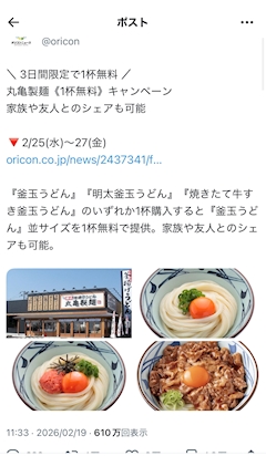 おはようございますあむです🐰 . . なんとなんと!! . . 2/25~27の3日間丸亀製麺で釜玉うどん1杯無料で食べれるらしいです . . 1杯頼んだら!ね . . シェアでもOKらしいです . . これはアツい、、、、 . . 絶対行くぞー!! . .