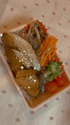 おはよう🫧🤍 うたです👸🏻🩷 スーパー行ったらブリの骨無しが安くなってて 速攻カゴに入れたよね😀魚だいすきまん そのブリを照り焼きにしてお弁当に持っていきました😗🌟 久しぶりに作ったけど美味しかった🤭💕