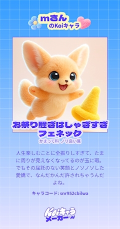 おはようございます みなです😻✨ ちょこちょこ見かける性格診断やってみました笑 お祭り騒ぎはしゃぎすぎフェネックwwww とりあえずうるさそうなキャラでた笑 けど結構しっかり当てはまってておもろい笑 みんなもやってみてーー笑