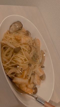 こんばんは うたです👸🏻🩷 にんにく大量摂取第二弾ペべロンチーノつくった! 余ってた海老と牡蠣入れたから出汁出て美味かった✌🏻 あんなにだいすきだった五右衛門もう3ヶ月以上行ってないびっくり パスタは自分で作ればいいやって気づいた😌👍🏻