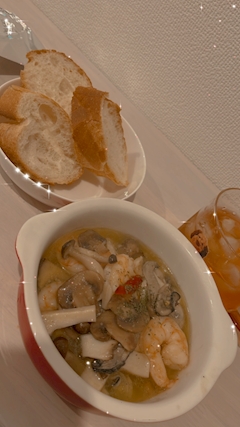 こんばんは うたです👸🏻🩷 やすみで誰にも会う予定がなかったので この機会ににんにく大量摂取しました😀✌🏻🧄 まず第一弾はアヒージョ😌💖 海老と牡蠣入れて豪華に😽💫💫
